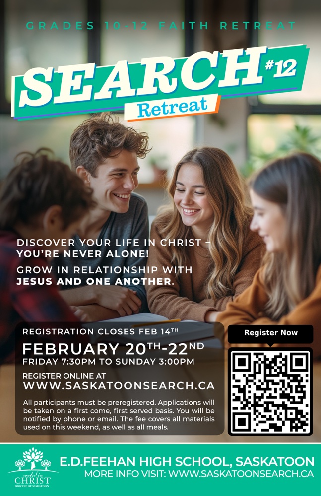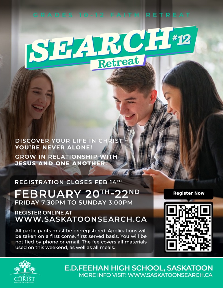 The Retreat takes place Friday, 7:30 PM to Sunday, 3:00 PM at E.D. Feehan High School in Saskatoon